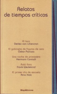 Este pequeño volumen de Ellago Ediciones, que acabo de descubrir y de leer, fue publicado hace algunos años (2006), pero todavía está disponible y atesora un puñado de relatos de gran interés, escritos en las últimas décadas del siglo XIX. La etiqueta bajo la que aparecen agrupados –naturalismo germano– puede confundir al lector español. Según la traductora, Eva Fructuoso, estos relatos «sorprenden, en conjunto, por la violencia con la que están escritos, como si la aproximación a la realidad no fuese posible más que mediante una inmersión, un ‘lancémonos’ que le dejase a uno desnudo ante los hechos.» Algunos rasgos comunes a todos estos textos son la distorsión de la realidad, el humor ácido, la desmitificación, y en ocasiones una ruptura del discurso literario convencional. En El loco, de Detlev von Liliencron, asistimos a una escena bélica del conflicto franco-prusiano, cuya resolución pone en evidencia de manera simbólica (con el payaso bailarín) la locura de la guerra. El gabinete de figuras de cera, de Oskar Panizza, constituye el relato más extenso de la colección. El narrador describe en primera persona su asistencia a un espectáculo de feria, a una exhibición de autómatas que representan diversas escenas de la Pasión de Cristo. El tono alucinado y grotescamente cómico, así como la irreverencia son rasgos característicos de Panizza, que en su atención a los autómatas y a su componente siniestro e inquietante sigue los pasos de Hoffmann. El brevísimo texto de Hermann Conradi, Una noche de primavera, parece ser solo una burla del «sehnsucht» romántico. El siguiente relato, Rabí Esra, de Frank Wedekind, logra su comicidad a través de los cínicos consejos que un padre da a su hijo a la hora de buscar la esposa ideal, que parecen subvertir los preceptos de la religión mosaica. Finalmente, en El primer día de escuela, de Arno Holz, reconocemos el texto formalmente más innovador de la colección, aliñado con un lenguaje vulgar cuidadosamente reproducido, onomatopeyas chirriantes y desaforadas, y un desarticulado monólogo interior que es casi stream of consciousness. El primer día de escuela del «pequeño Jonathan», víctima de la violencia escolar y de un ambiente brutal, feo y enloquecido: una diminuta y descarnada Odisea.
