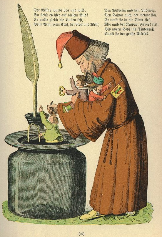 La primera de las parodias, Tragatrufas (Truffle Eater, 1933), escrita por Humbert Wolfe y dibujada por Archibald Louis Charles Savory (bajo el seudónimo de Oistros), se compuso tras la toma del poder por los nazis a principios de ese mismo año. En el texto aparecen ya algunos de los principales jerarcas del régimen, como Edmund Heines, Göring o Goebbels, así como otros personajes menos recordados o de etapas anteriores (Ludendorf, Ernst Roehm…). Hitler, que figura caricaturizado como Pedro Melenas en el frontispicio del libro, no hace acto de presencia hasta el capítulo final, donde lo veremos entregado a su delirante sueño de conquistar el mundo: un inquietante presagio que pronto amenazaría con cumplirse. Entre los abusos y atrocidades denunciadas por el Tragatrufas podemos señalar las cometidas contra los judíos, la quema de libros o el incendio provocado del Reichstag. Tragatrufas guarda una notable independencia respecto al texto original de 1845, del que no parodia todas sus historias y completa con algunas enteramente nuevas. Como ya anunciamos más arriba, no era la primera vez que se tomaba el Struwwelpeter como vehículo para la parodia política. Solo unos pocos años después de su aparición original se publicó en Alemania Der Politische Struwwelpeter (1849), y durante la Gran Guerra vieron la luz otras dos parodias bélicas, una en lengua inglesa y otra en alemán. De estas y otras adaptaciones, tanto anteriores como posteriores a Tragatrufas y Hitler Greñas, nos informa Roberto Vivero en su breve pero muy documentada Nota del editor, donde también nos facilita las claves necesarias para una mejor interpretación de los textos traducidos.